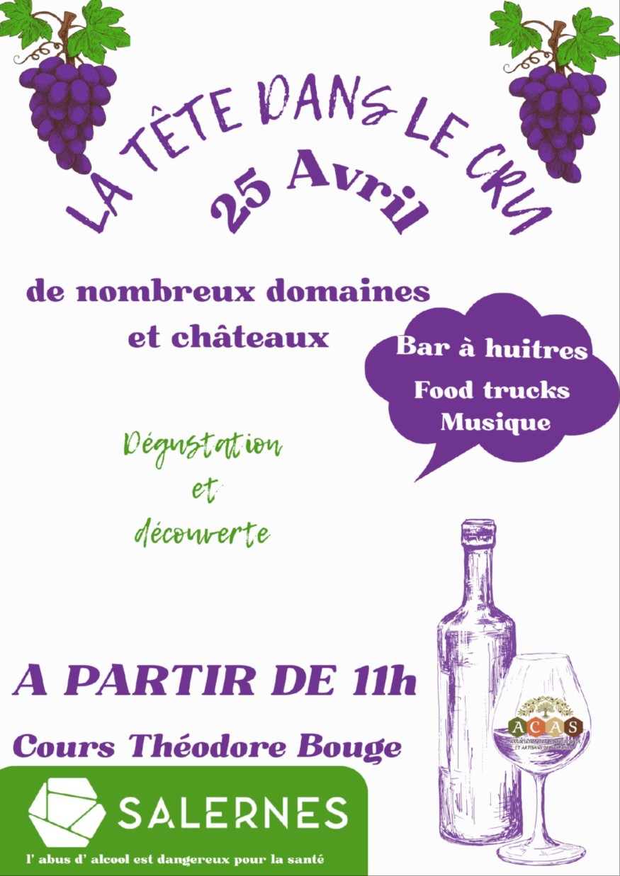 Le 25 avril 2026, de 11h à 22h, la place Théodore Bouge à Salernes accueillera la 4ᵉ édition de “La Tête dans le Cru”, organisée par l’ACAS – Association des Commerçants et Artisans de Salernes. L’association assurera également la vente des verres permettant de participer aux dégustations.