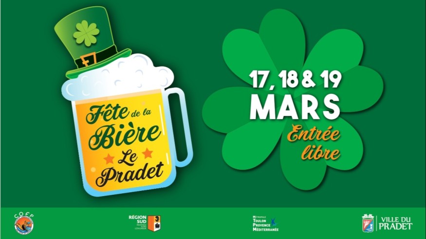 Rendez-vous désormais incontournable, la Fête de la Bière au Pradet aura lieu les 17, 18 et 19 mars 2023. Cette année à l'occasion de la Saint-Patrick le chapiteau arborera les couleurs vert et orange ! Groupes folkloriques, trèfles (à quatre feuilles, évidemment) et chapeaux haut de forme, bienvenue en Irlande !