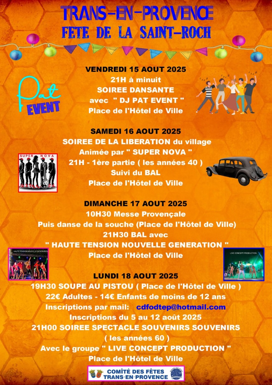 Animation musicale, aprés midi récréative, messe provencale, repas. Organisé par le Comité des Fêtes de Trans en Provence voir programme ci dessous