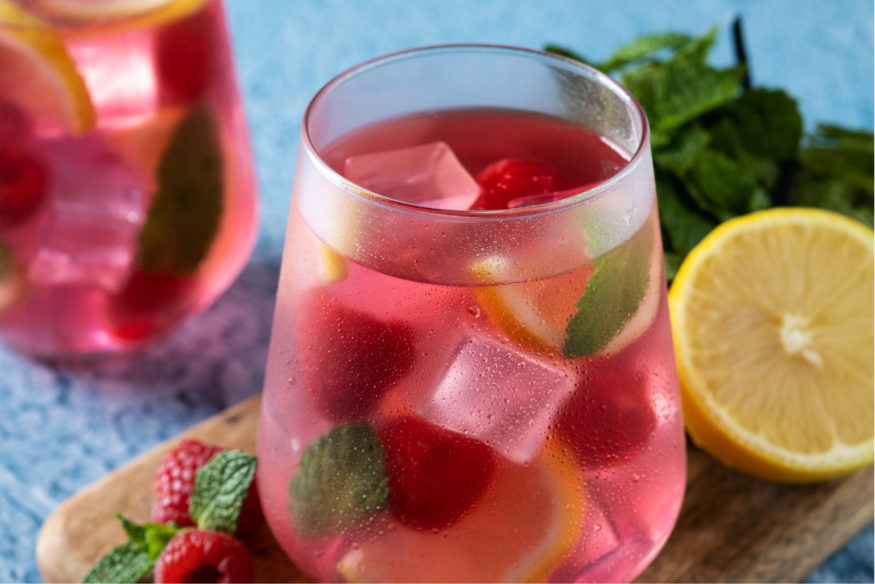 L’eau gazeuse devient festive lorsqu’on l’habille de quelques framboises fraîches, d’un zeste de citron vert, ou d’un sirop fait maison. Simple, mais très élégant.
